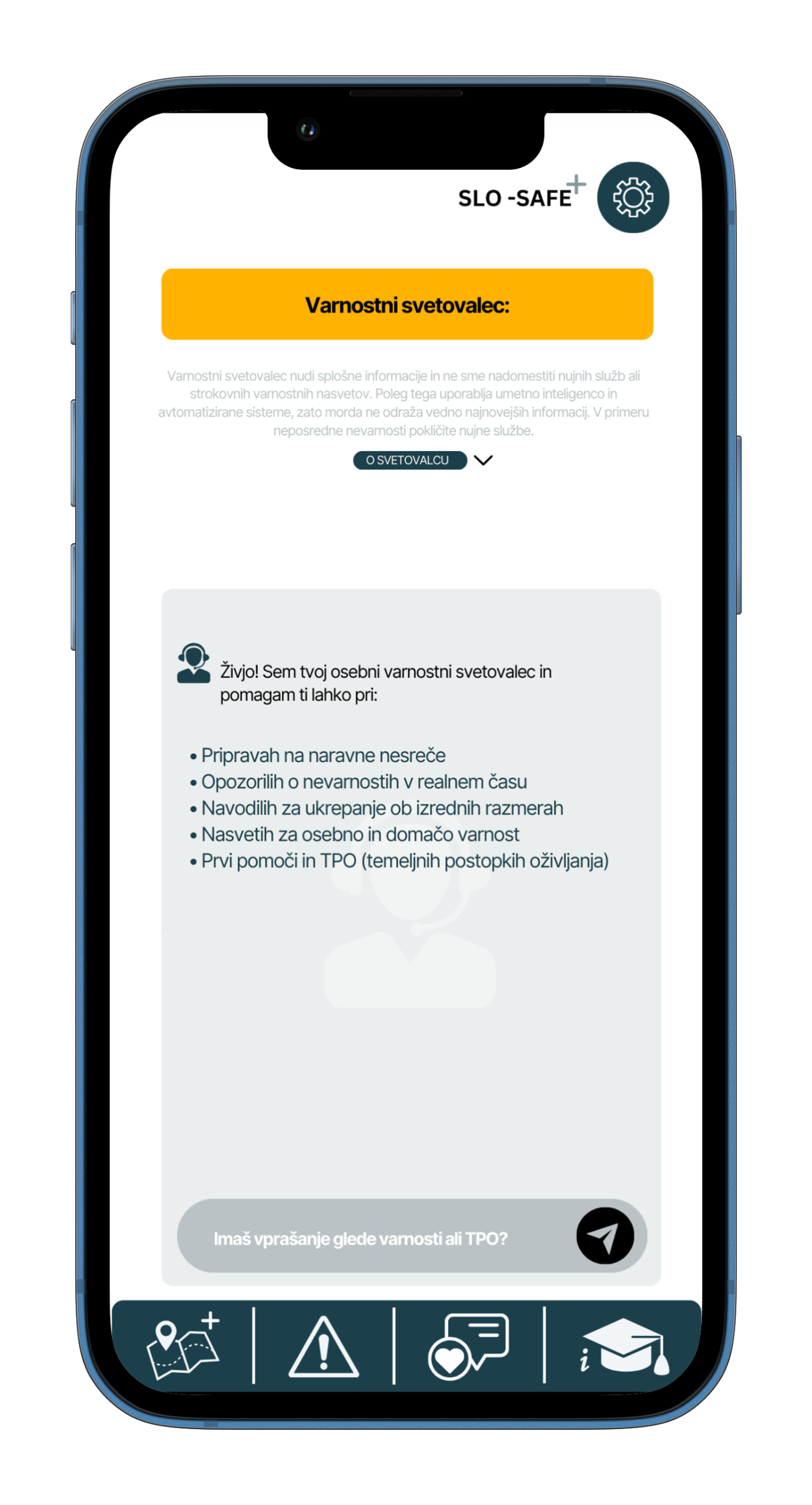 SloSafe je inovativna aplikacija, ki te v realnem času obvešča o nevarnostih v tvoji bližini in ti omogoča, da se pravočasno in pravilno odzoveš nanje. Z naprednimi funkcionalnostmi postane nepogrešljivo digitalno orodje za tvojo varnost.