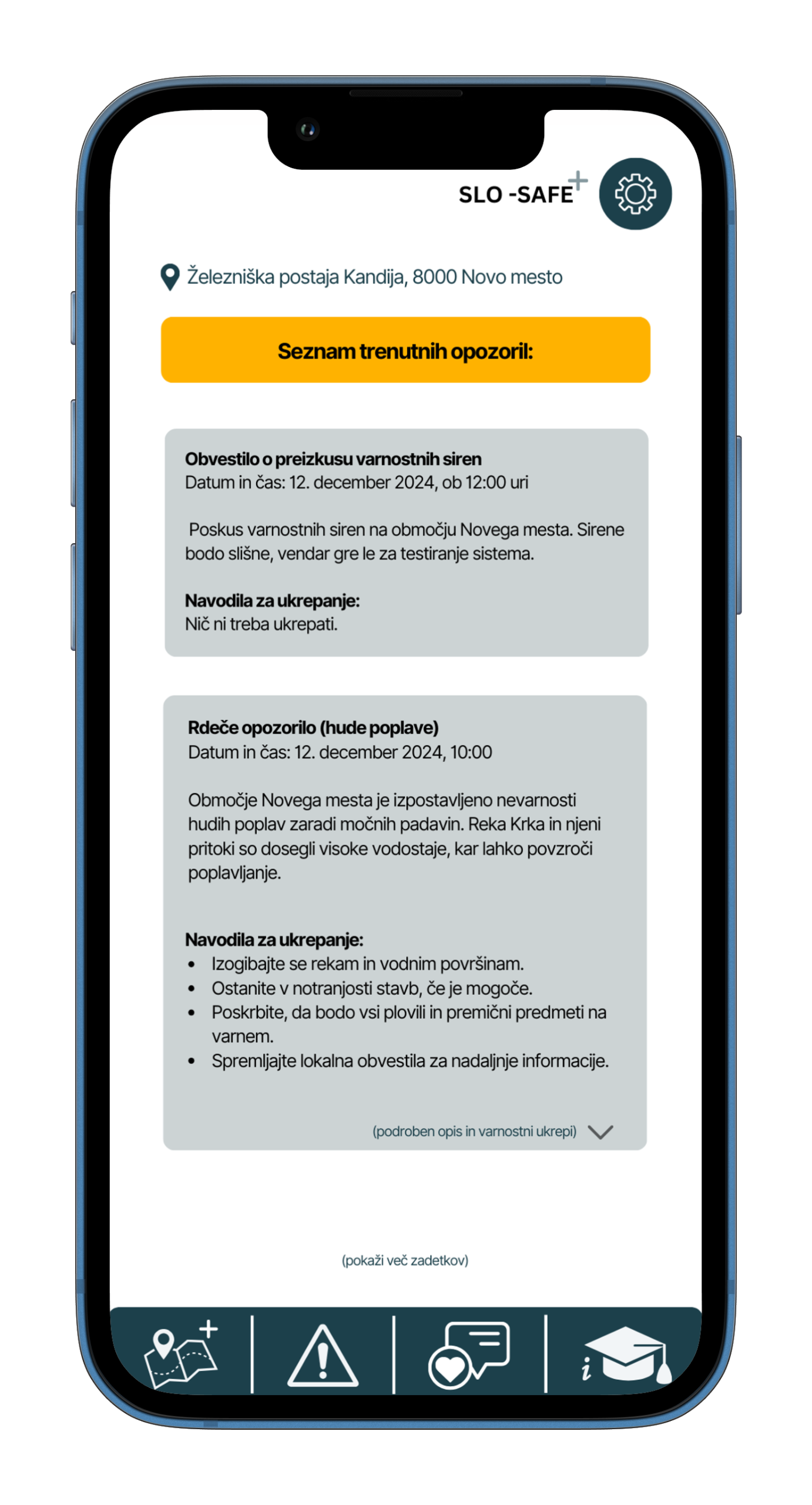 Aplikacija prikazuje sprotna opozorila za trenutno lokacijo uporabnika, ki so pridobljena iz zanesljivih virov, kot je ARSO. Opozorila vključujejo vremenske nevarnosti (npr. rdeče opozorilo za poplave) ter navodila za ukrepanje.V prihodnje bo funkcionalnost razširjena na prometna opozorila in državne varnostne informacije (npr. preizkus siren), kar bo izboljšalo pripravljenost in odzivnost prebivalcev.