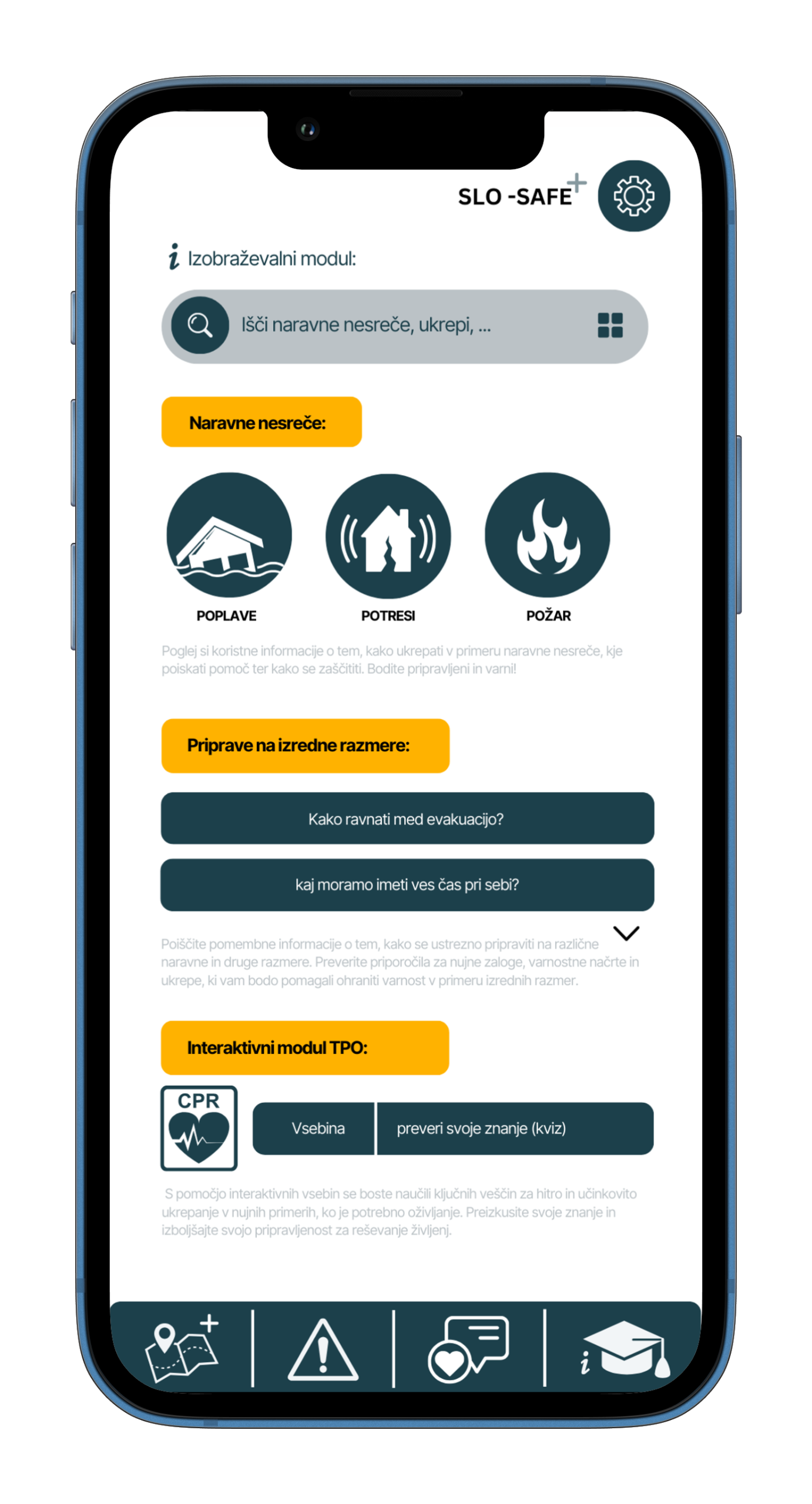SloSafe je zasnovan tako, da ti omogoča hiter dostop do ključnih informacij v primeru nevarnosti. Z intuitivnim vmesnikom in napredno tehnologijo ti aplikacija ponuja natančne podatke, interaktivne funkcije in prilagojene nasvete, ki ti lahko rešijo življenje.